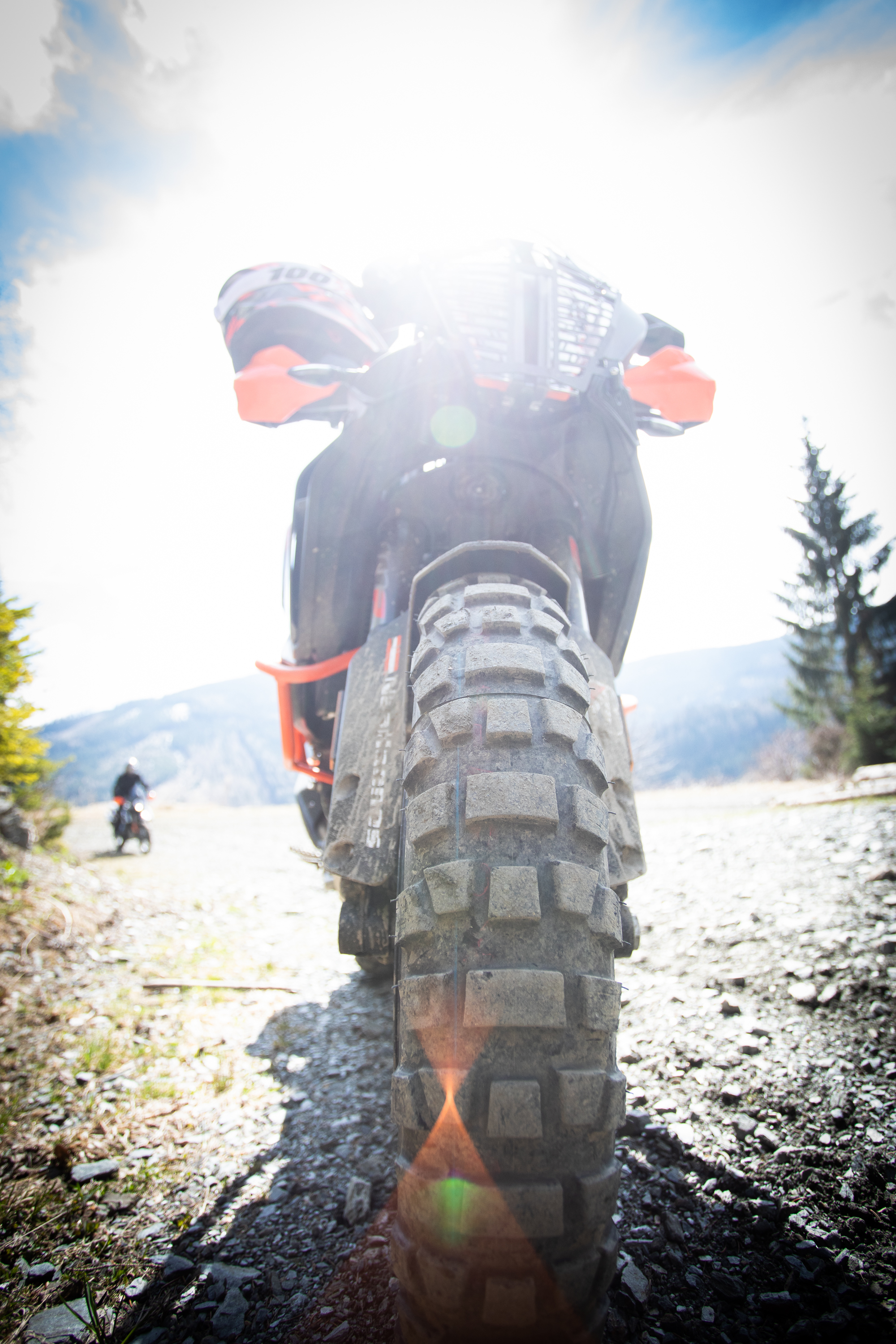 Aufgezogen in 120/70/19 bzw. 170/60/17 auf NaaHannes KTM 1290 Super Adventure S fuhren wir in Niederösterreich in ein ca. 90 ha großes, im Gebirge liegendes Waldgebiet mit erstklassigen Schotterstraßen. PERFEKTES Testgebiet für unsere Big Bikes und den optisch sehr aggressiv wirkenden AX41. Und um den Spaßfaktor für uns zu erhöhen hatten wir nicht nur das eine Bike mit, sondern gleich den kompletten Offroad Fuhrpark von Kurvenfahrer! (2 x KTM 1290 Super Adventure S und die brandneue KTM 790 Adventure R) Wir hatten losen scharfkantigen Schotter, felsigen Untergrund, Erdige und schlammige Abschnitte sowie auch noch etwas Schnee zur Verfügung. Traumhaft, damit konnten wir uns die gängigsten Bodenbeschaffenheiten zur Brust nehmen.