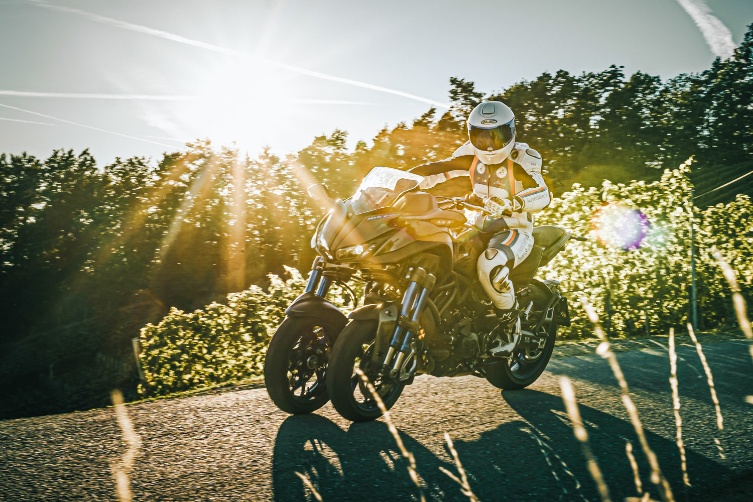 Die größten Unterschiede liegen im Anbremsen, zwei Räder an der Front bremsen einfach unglaublich gut, und im Kurvengrip. In Schräglage ist der Grip an den Vorderrädern pervers hoch. Ich habe dies auf zwei Arten getestet, zum einen auf einer Straße mit weiten und zügigen Kurven mit extrem vielen Teerausbesserungen und zum anderen auf der Rennstrecke. Auf der schlechten Straße bietet einfach immer ein Rad Grip, aber ohne es zu spüren, dass eines eventuell keinen Halt hat. Man merkt es am Hinterrad, denn dieses gibt normales Feedback und verliert schon mal Traktion auf dem rutschigen Teer, wie bisher gewohnt – aber alles kein Thema und man fährt seine Kurven wie auf Schienen. Auf dem Racetrack habe ich es dann mit Speed probiert. Von Runde zu Runde mehr Kurvenspeed, bis es schließlich so viel war, dass bereits wieder am Hinterrad die Haftgrenzen erreicht waren, da war vorne noch immer nicht der Hauch von Instabilität zu spüren. Auch bei der Schräglage konnte ich keine größeren Probleme gegenüber anderen Bikes in dieser Klasse feststellen. Die Fußrasten schleifen schon mal, aber wenn man die Schleifnippel entfernt gibt es noch immer genügend Spielraum.