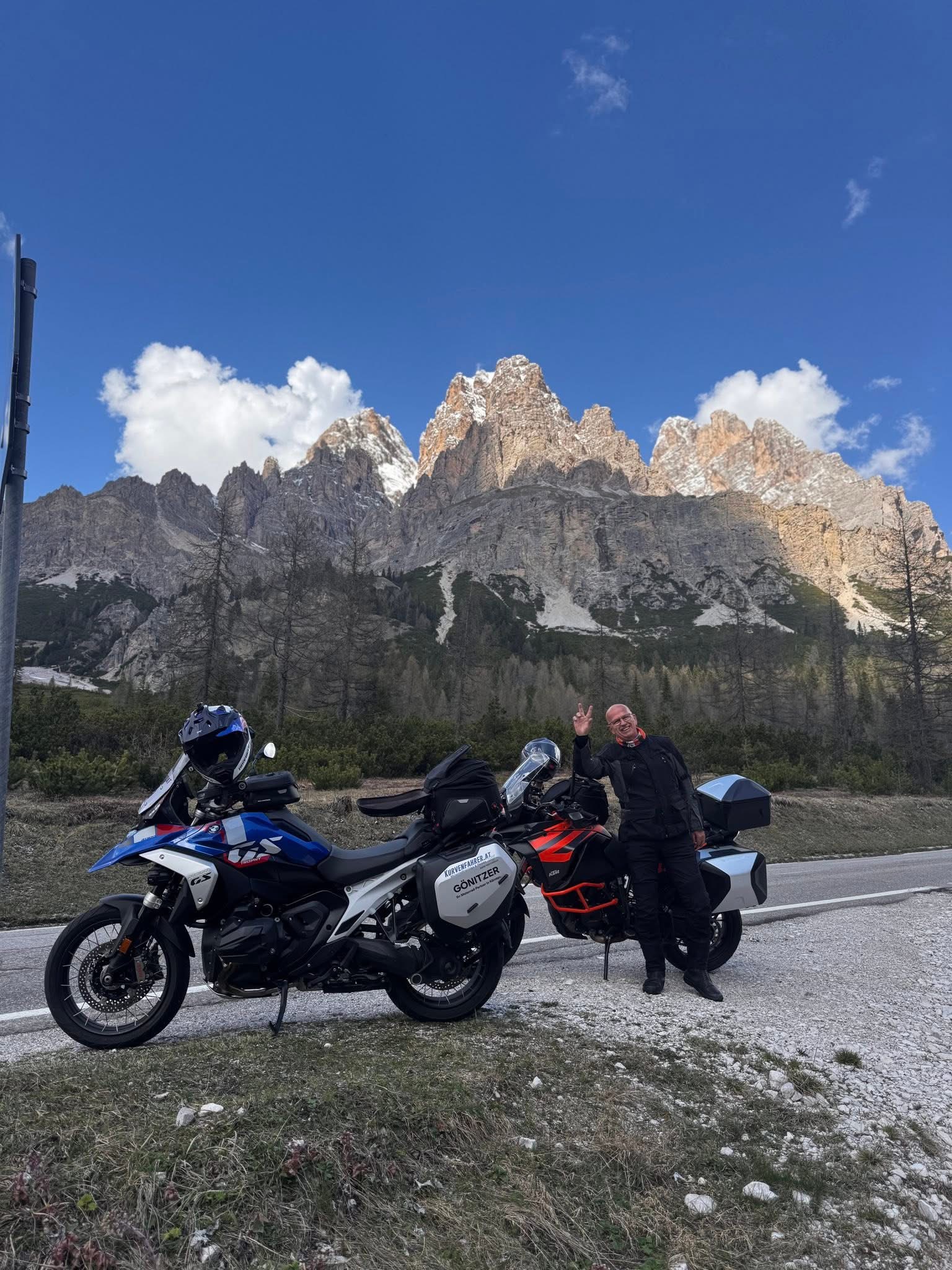 Ab Villach ging’s dann zu zweit weiter – mitten hinein in die Dolomiten. Kurven, Pässe, traumhafte Ausblicke und das alles bei Null Verkehr! Einfach herrlich. Bis… ja, bis Cortina. Dort kippte das Wetter von 25 Grad und Sonnenschein auf 5 Grad und Weltuntergang – in wenigen Minuten – aber immer die Sonne in der Ferne in Sicht. Am Passo Falzarego begrüßte uns nicht nur starker Regen, sondern auch Hagel. Aua! Als der Asphalt plötzlich weiß war, wurde uns klar: Bloß nicht stehen bleiben – einfach durchziehen! Zumindest hatten wir weiterhin die Straßen für uns allein. 😄
